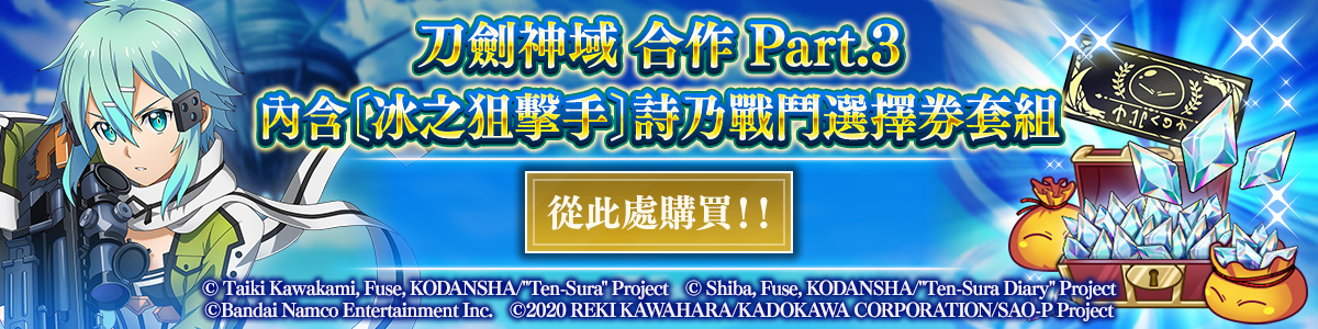 可獲得315個魔晶石,以及〔冰之狙擊手〕詩乃機率15% 刀劍神域 合作 Part.3 保證極★5招募券1張。