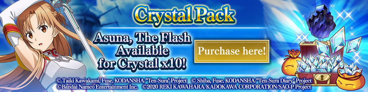 You can obtain Asuna, The Flash Featured Sword Art Online Collab Part 2 5★ EX Rates 30% 5★ Battle Character Guaranteed Recruit Ticket x2, Asuna, The Flash Featured Crystal x4, and Magicrystal x1,050.