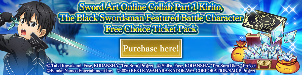 You can obtain Kirito, The Black Swordsman Featured Battle Character Free Choice Ticket x1 and Magicrystal x1,050.